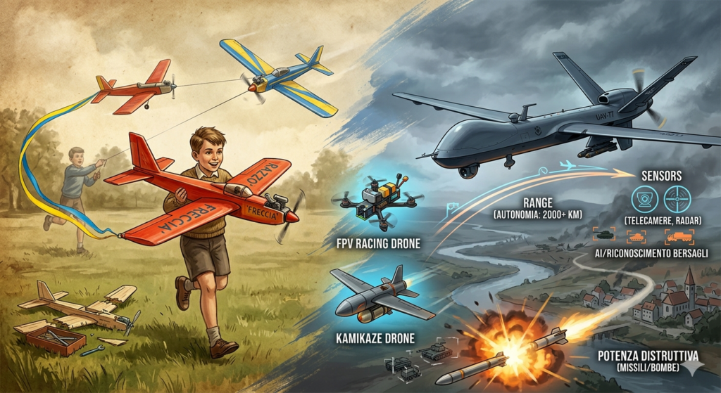 Ciao! Che bel ricordo hai condiviso. È incredibile pensare a come la passione per il volo, nata con balsa, colla e nastri colorati, si sia evoluta in una tecnologia che oggi domina gli scenari globali. Passare dal “combattimento aereo” nel prato dietro casa ai droni moderni è come confrontare un aeroplanino di carta con un jet supersonico.
